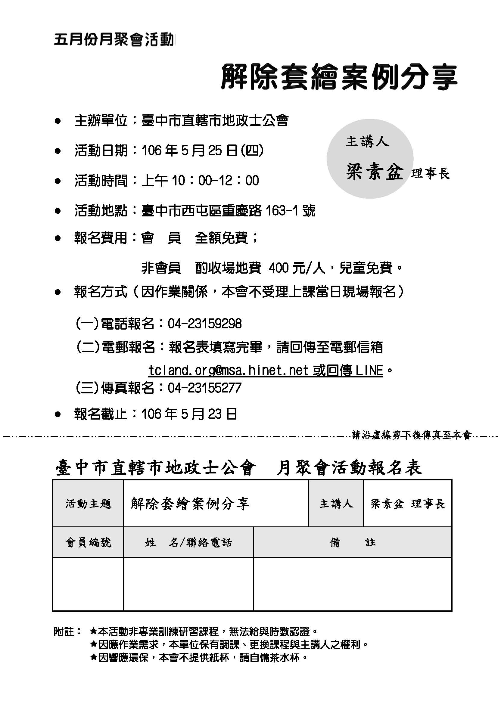 106年5月份會員月聚會活動訊息(歡迎報名)-活動日期 106年5月25日 主講人:梁素盆理事長 主題:解除套繪案例分享