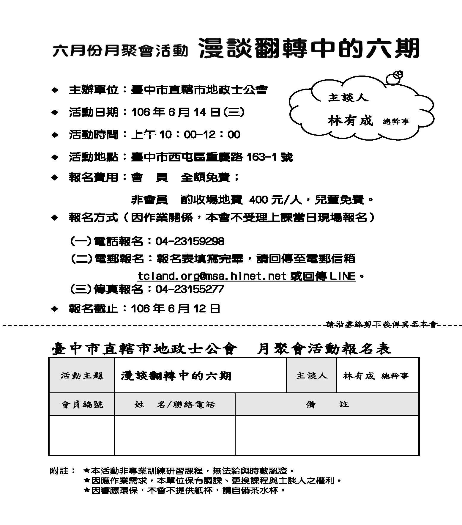 106年6月份會員月聚會活動訊息(歡迎報名)-活動日期 106年6月14日 主談人:林有成總幹事 主題:漫談翻轉中的六期