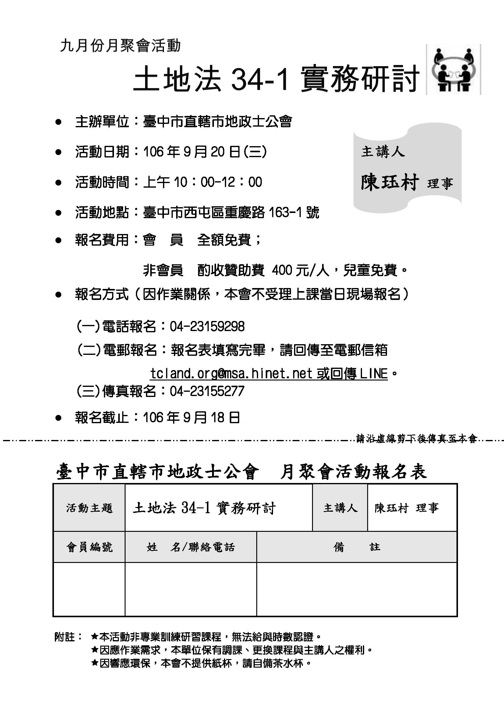 106年9月份會員月聚會活動訊息(歡迎報名)-活動日期 106年9月20日 主講人:陳珏村理事 主題:土地法34條之1實務研討