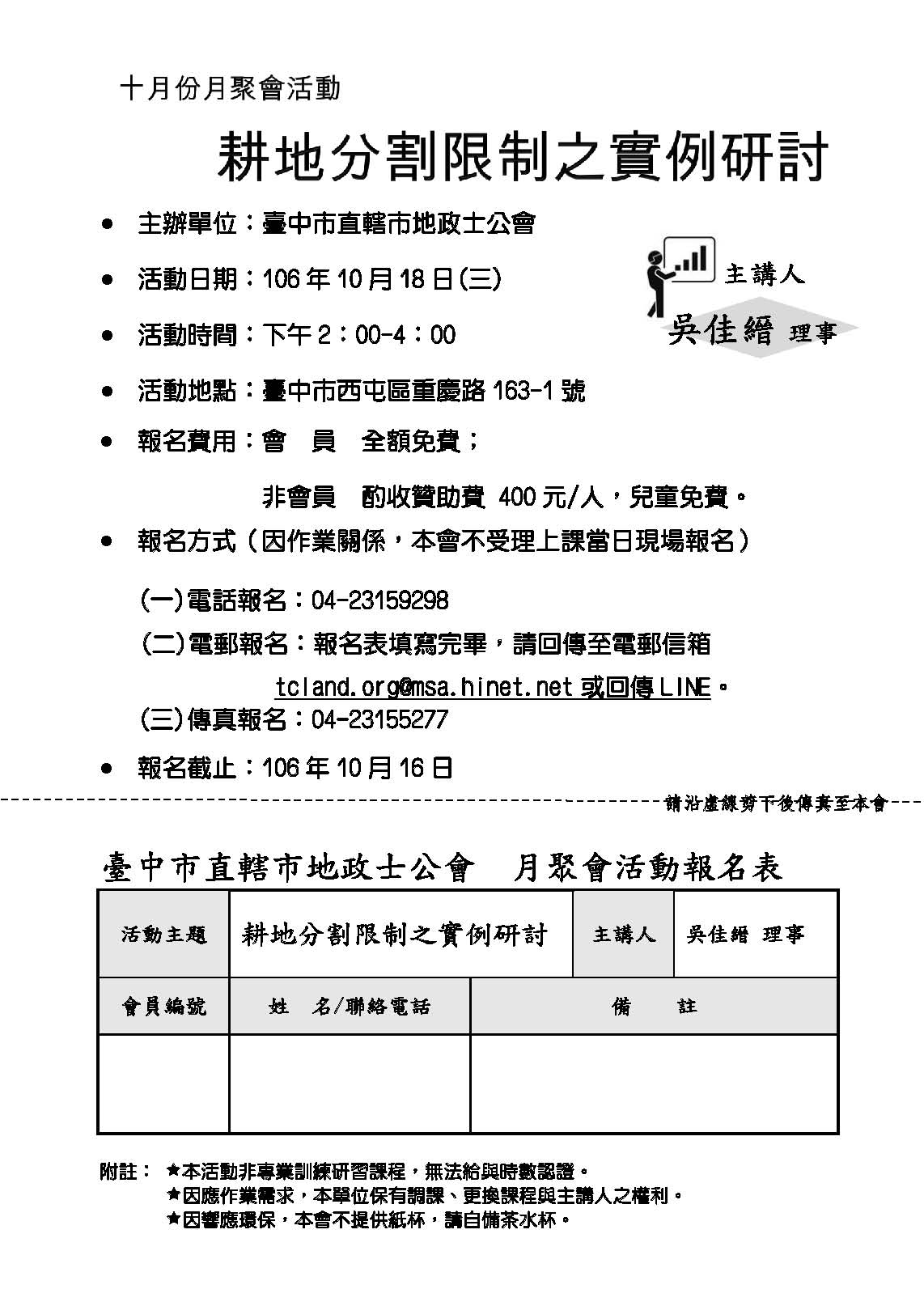 106年10月份會員月聚會活動(歡迎報名)-活動日期 106年10月18日(三) 主講人:吳佳縉理事 主題:耕地分割限制之實例研討