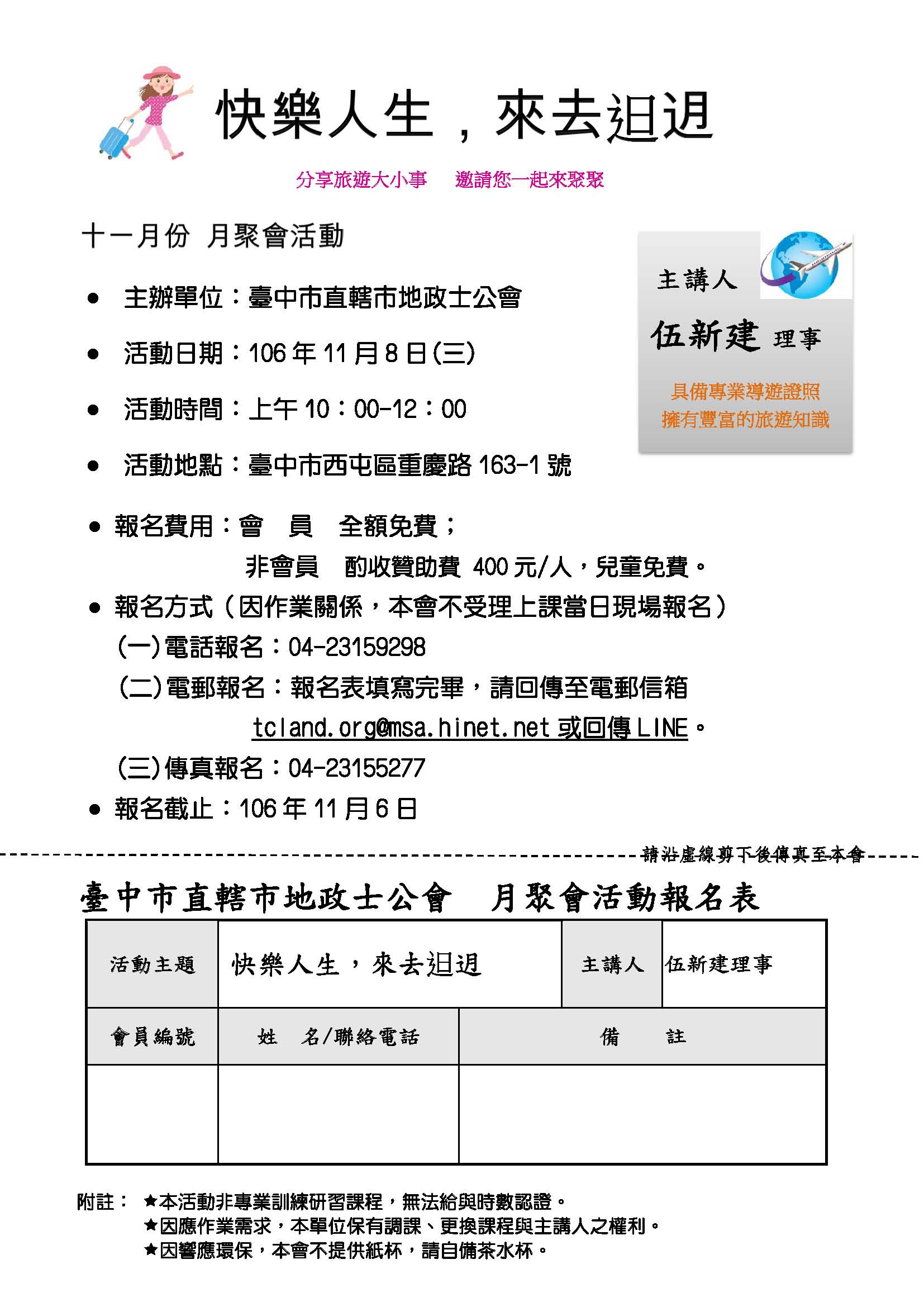 106年11月份會員月聚會活動(歡迎報名)-活動日期 106年11月8日(三) 主講人:伍新建理事