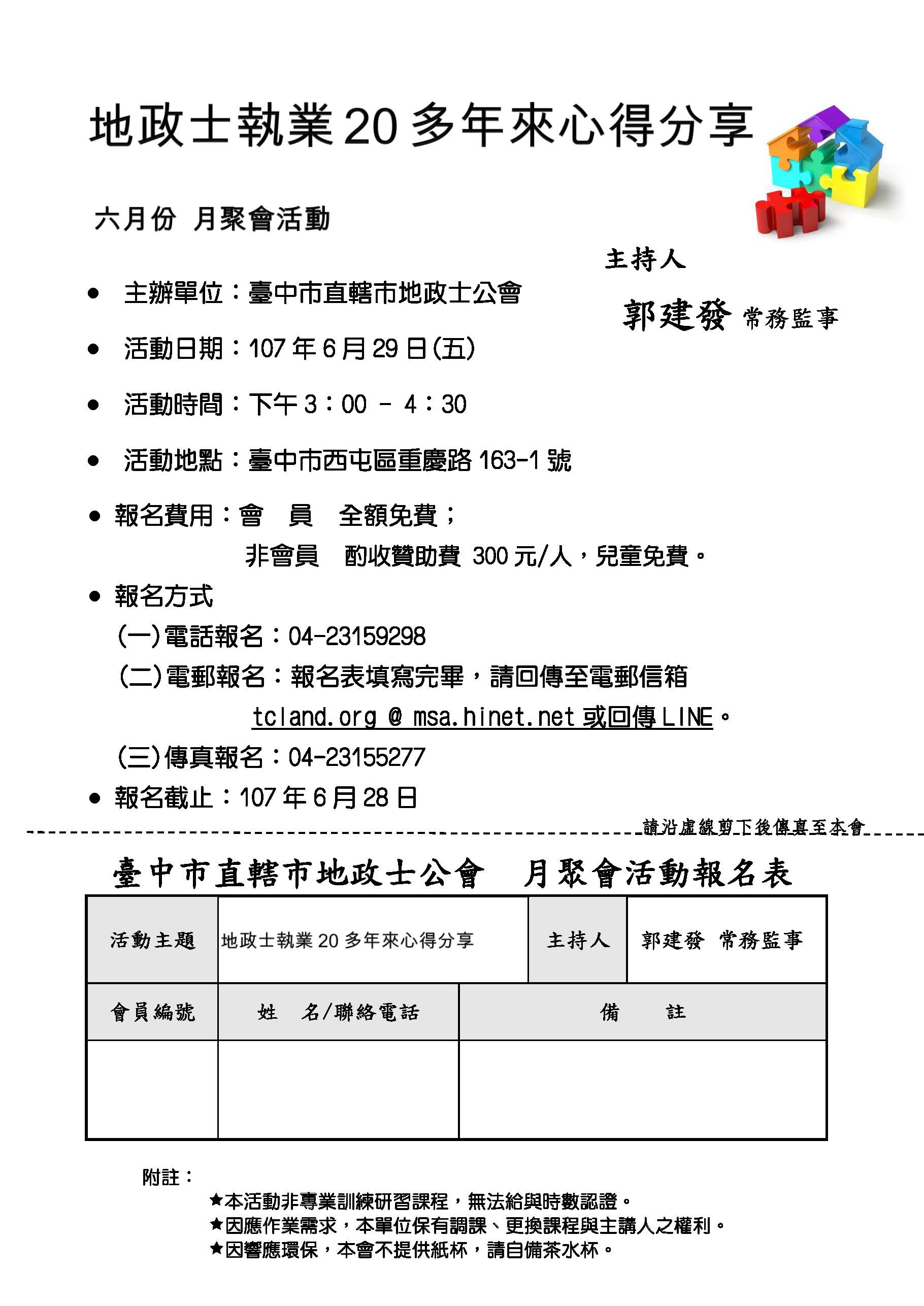 六月份會員聚會-107/6/29(五) 講題:地政士執業20年來心得分享