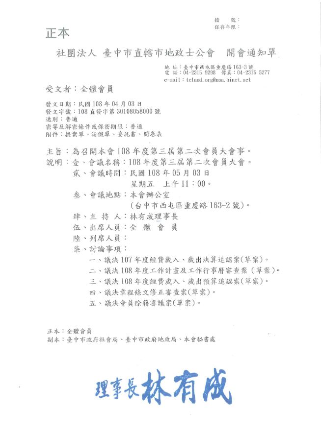 本會召開108年度第三屆第二次會員大會開會日期:108/5/3(五)上午11時~12時
