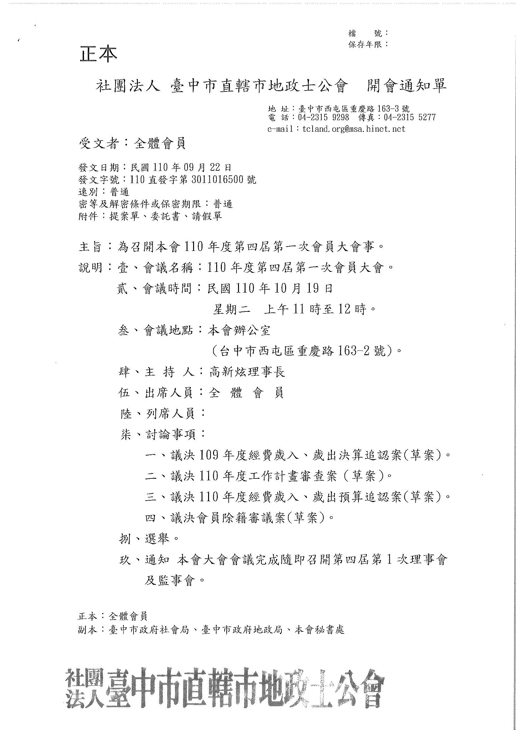 本會召開110年度第四屆第一次會員大會 (開會日期:110/10/19(二)上午11時~12時)。