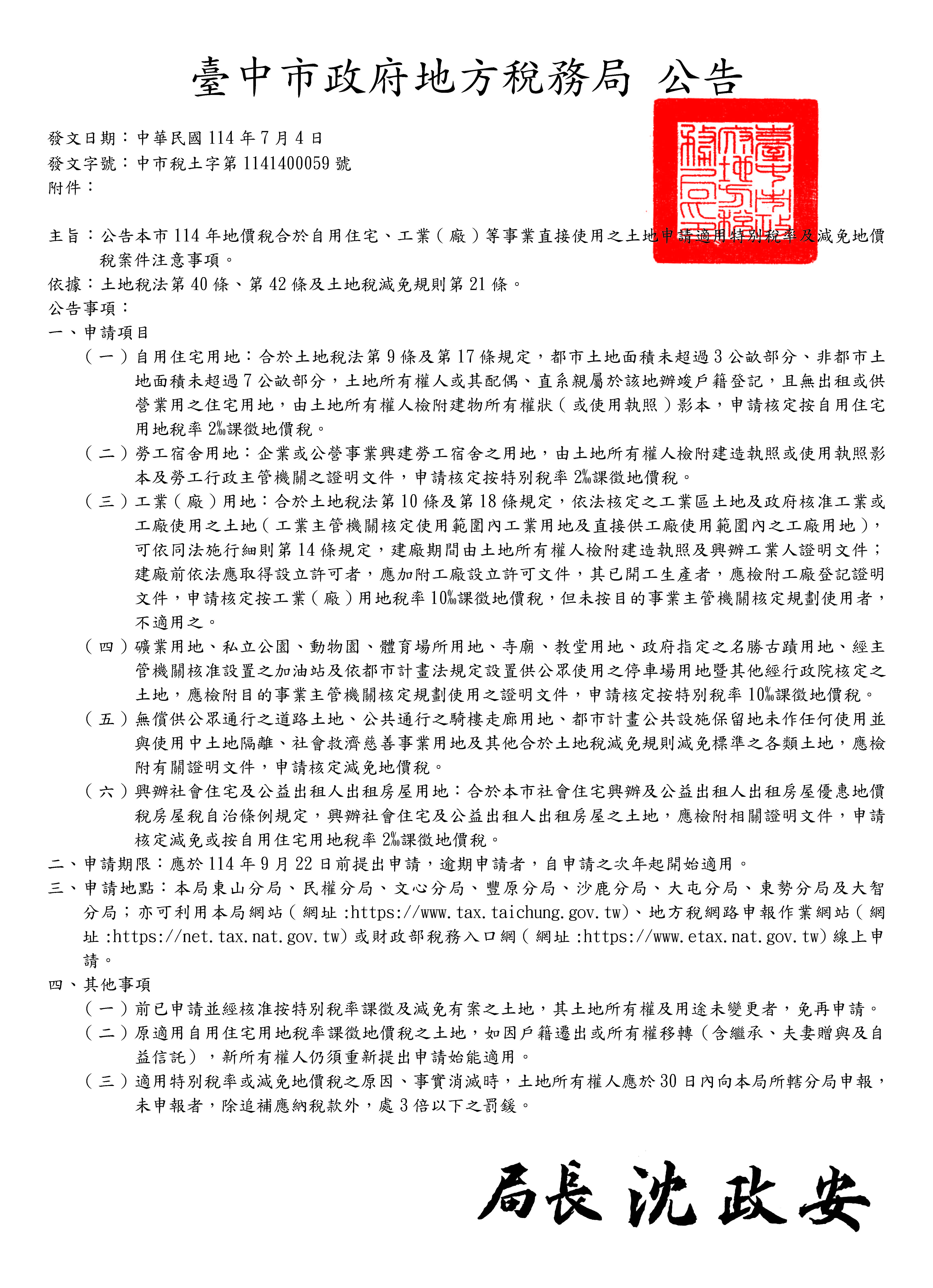114年地價稅將於11月1日開徵,適用特別稅率及合於減免地價稅土地,依規定應於開徵40日前(即9月22日前)提出申請,逾期申請者,自申請之次年起開始適用,詳如附件公告。